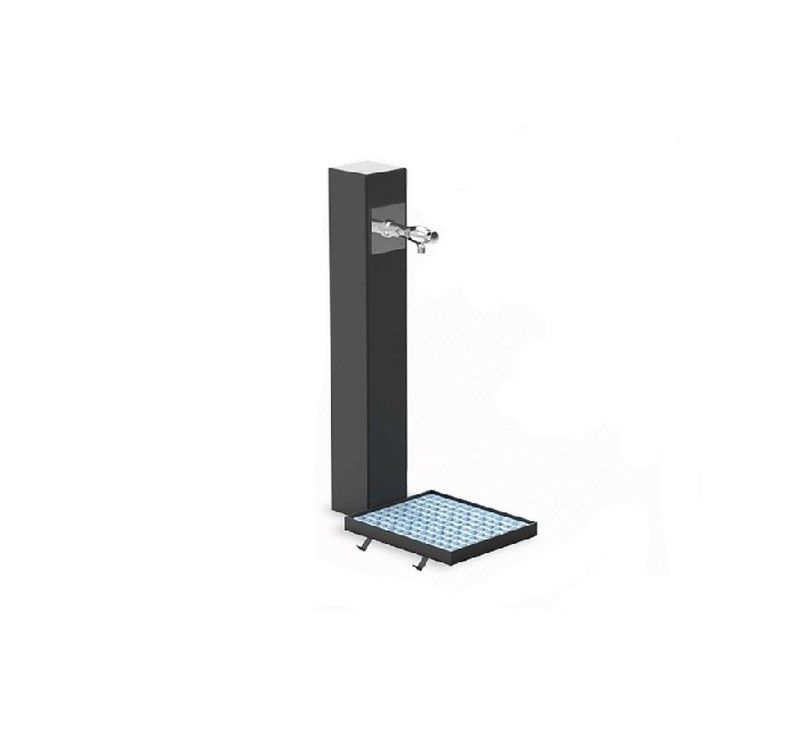 Font fabricada en acer Pintat oxiró en pols al forn. Disponible en diverses opcions. Aixetes polsador temporitzat prest amb regulació de cabal d'aigua. Reixeta d'acer galvanitzat i flexo de connexió d'entrada d'aigua. Opcional reixeta en fosa.