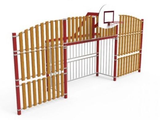 Frontó mitjà format per una estructura de porteria, panell amb 68 llistons en fusta de pi i un cèrcol de bàsquet amb xarxa, ideal per jugar a futbol/handbol o bàsquet. Aquest equipament esportiu de gran qualitat, no requereix manteniment, és molt resistent, 100% reciclable i respecta el medi ambient.