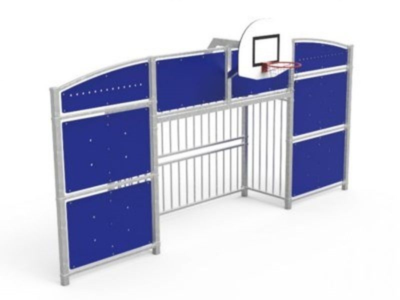 Frontó mitjà format per una estructura de porteria, 8 panells de polietilè (HDPE) i un cèrcol de bàsquet amb xarxa, ideal per jugar a futbol/handbol o bàsquet. Aquest equipament esportiu de gran qualitat, no requereix manteniment, és molt resistent, 100% reciclable i respecta el medi ambient.