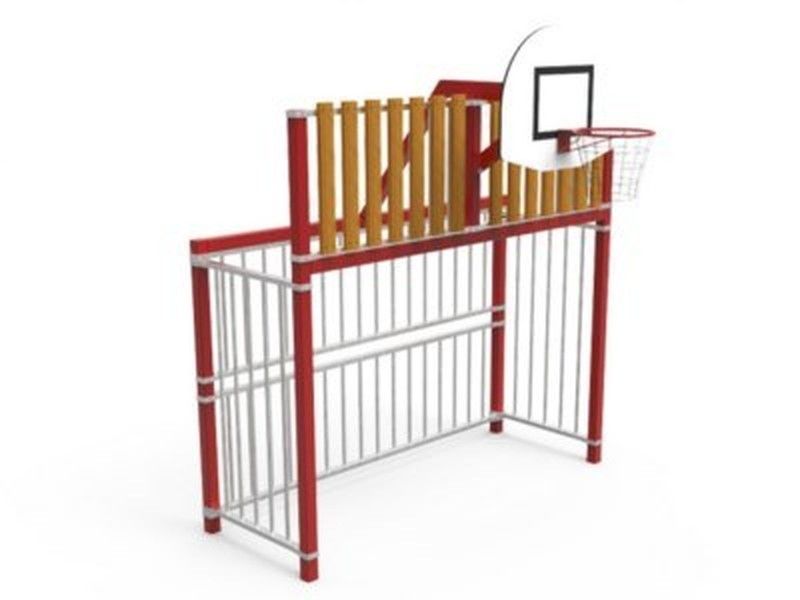 Frontó petit format per una estructura de porteria, panell amb 14 llistons en fusta de pi i un cèrcol de bàsquet amb xarxa, ideal per jugar a futbol/handbol o bàsquet. Aquest equipament esportiu de gran qualitat, no requereix manteniment, és molt resistent, 100% reciclable i respecta el medi ambient.