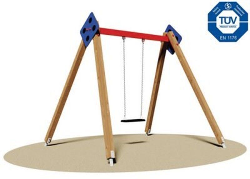 - Columpi: Seient pla de cautxú antilliscant amb nucli intern d'alumini i cadenes galvanitzades en calent amb pas de malla estret per evitar l'emprenyament dels dits.