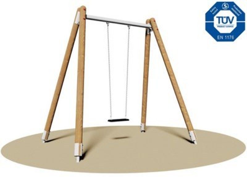 - Estructura: Consisteix d'una biga de Ø 8,9 cm en acer galvanitzat amb enganxalls per al seient i quatre pals de fusta oblics de secció circular de Ø 12 cm.