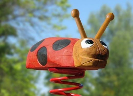 Joc de moll amb forma de marieta, model 4.03.02, tallada a mà i fabricada amb fusta de robínia amb un moll d'acer envernissat al forn amb dispositiu antipinzament de dits. Aquest joc de moll compleix les normes europees EN 1176 pel TÜV alemany - Product Service.