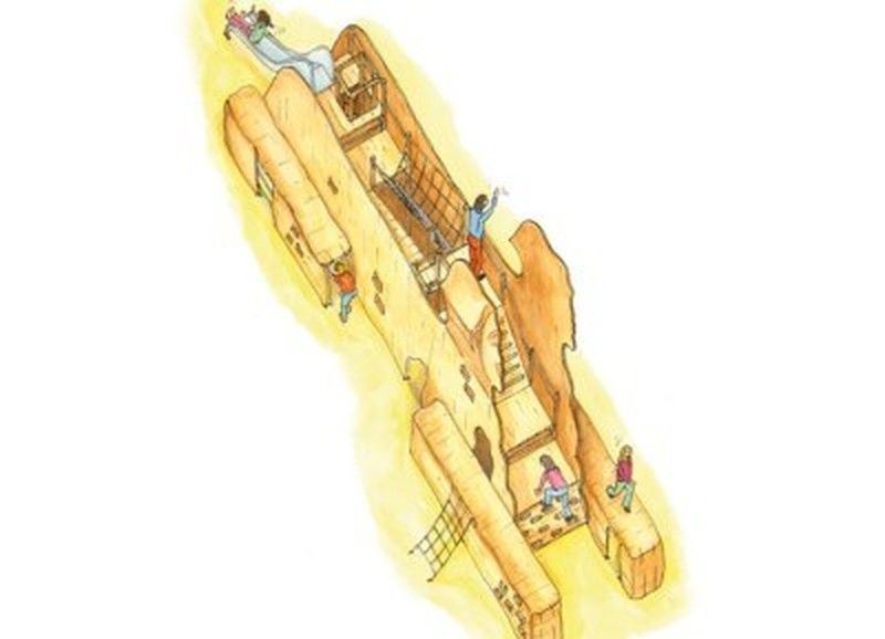Joc infantil de fusta de robinia TEMPLE ESFINGE 50.26.02., tallat a mà i fabricat amb fusta de robinia. Aquest joc de robínia per a parcs infantils amb temàtica d'egipcis compleix les normes europees EN 1176 pel TÜV alemany - Product Service.