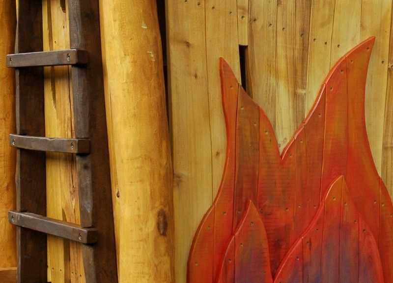 Joc infantil de fusta de robinia TORRE BOMBERS 50.20.02., tallat a mà i fabricat amb fusta de robinia. Aquest joc de robínia per a parcs infantils amb temàtica de bombers compleix les normes europees EN 1176 pel TÜV alemany - Product Service.