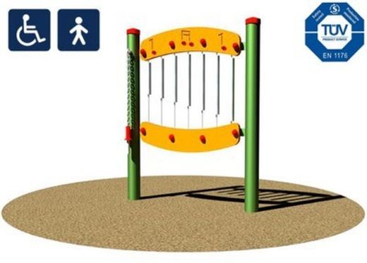 Panell sensorial XILÒFON - GJO0297, un joc de psicomotricitat que simula un instrument musical de percussió. Aquest joc està format per panells decoratius amb notes musicals, tubs penjats dʻacer i una baqueta per poder realitzar les notes musicals. Aquest joc infantil està certificat de conformitat amb les normes europees EN 1176 pel TÜV alemany - Product Service.