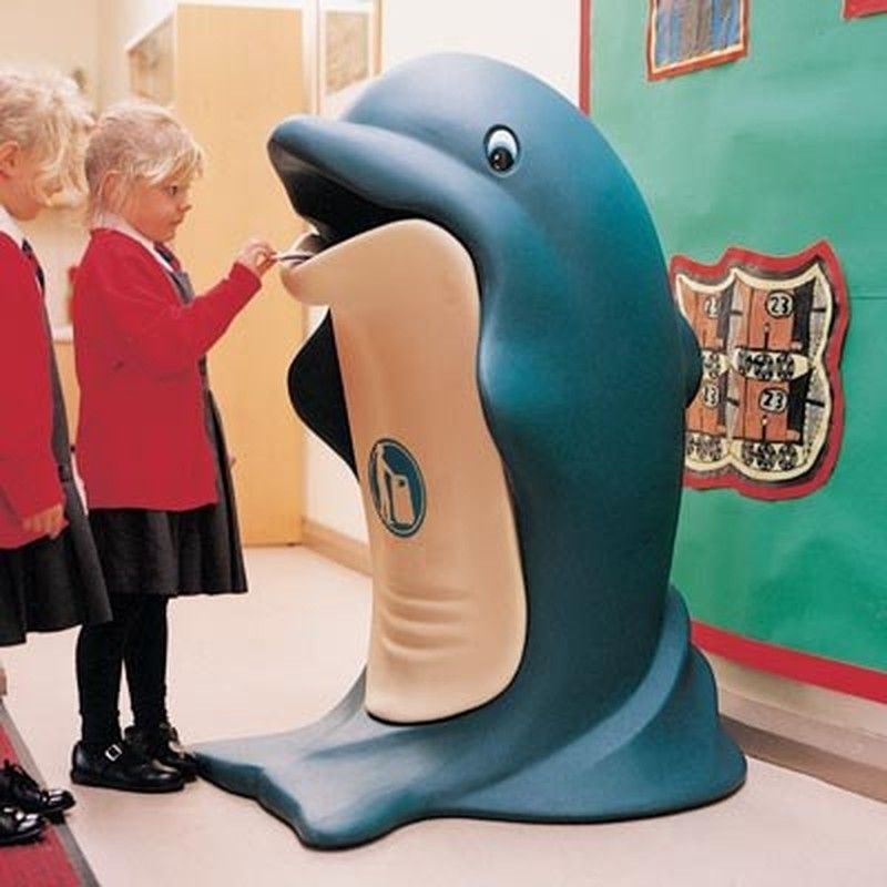 Paperera amb forma de Dofí, fabricada completament de durapol amb cantells arrodonits. Està paperera amb un disseny molt divertit, està pensada per convidar els nens a desfer-se de les escombraries correctament. Aquesta paperera és molt fàcil de netejar i disposa duna àmplia capacitat. Ideal per a tot tipus de zones, tant a l'interior com a l'exterior.