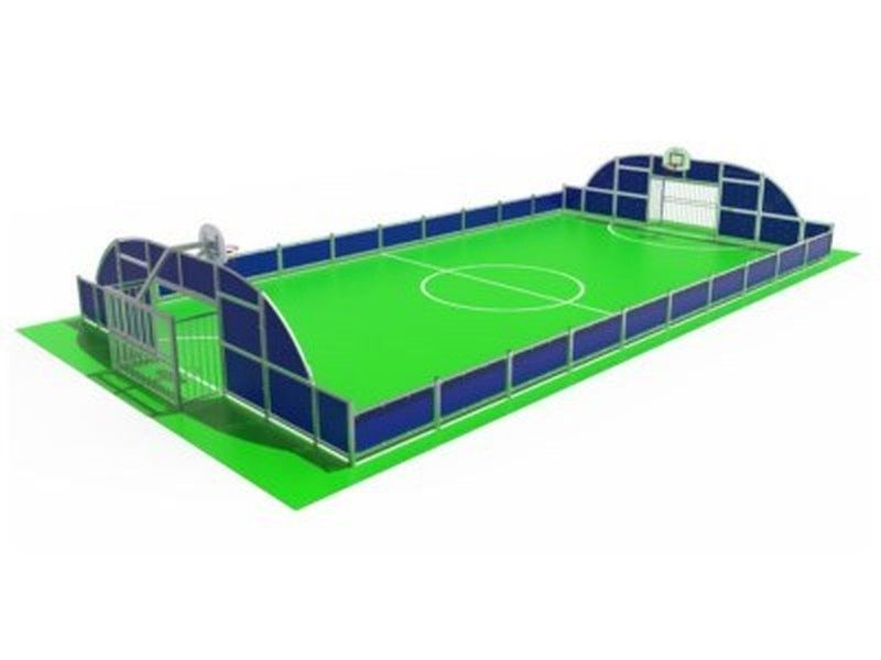 Pista Multiesport formada per 2 frontons amb 12 panells de polietilè (HDPE) i 1 cèrcol de bàsquet amb xarxa, "cada frontó", proveït de 2 parets "una a cada lateral" de 10 panells de polietilè (HDPE) "cada paret". Aquesta estructura completa és ideal per jugar a futbol / handbol o bàsquet. Aquest equipament esportiu de gran qualitat, no requereix manteniment, és molt resistent, 100% reciclable i respecta el medi ambient.