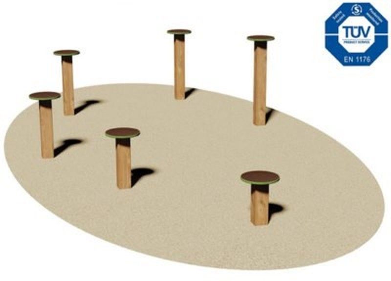 - Dimensions: 385 x 230 x 80 cm. 6 Pals de 9 x 9 cm fabricats de fusta de pi tractats a l'autoclau amb 7 bases circulars antilliscants de ø25 cm, fabricades en fusta contraxapada de bedoll encolades amb fenol. niló acolorit.