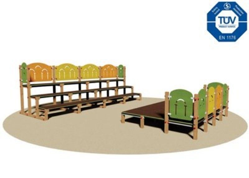 - Estructura: Compost per un escenari i seients a tres altures diferents, elevats per bigues de 7 x 7 cm i 4,5 x 7 cm. Als laterals disposa de panells acolorits de protecció en contraxapat de caoba.