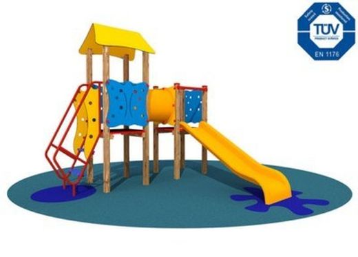 Torreta multijoc de fusta model Jasmine - 1103. Certificat de conformitat amb les normes europees EN 1176 pel TÜV alemany - Product Service.