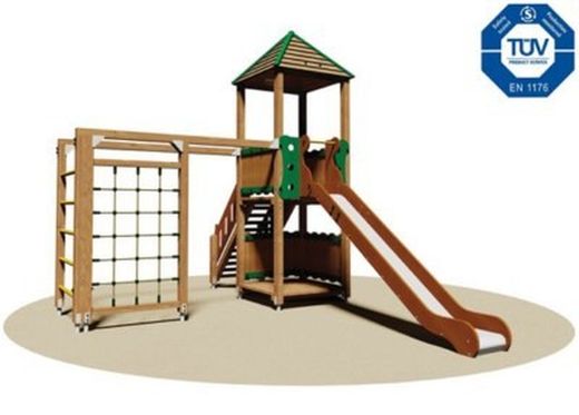 - Tobogan: De 150 cm d'alçada, amb pista d'acer inoxidable, laterals. Equipat amb tub de seguretat d'acer pintat en calent en forma de maneta.