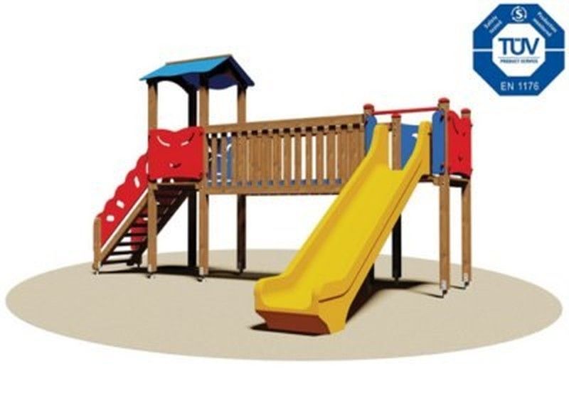 - Tobogan: Fabricat en polietilè d'alta densitat de 135 cm d'alçada, equipat amb tub de seguretat d'acer pintat en calent en forma de maníja.