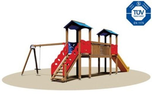 - Tobogan: Fabricat en polietilè d'alta densitat de 135 cm d'alçada, equipat amb tub de seguretat d'acer pintat en calent en forma de manilla. d'alumini i cadenes galvanitzades en calent amb pas de malla estret per evitar l'emprenyament dels dits.