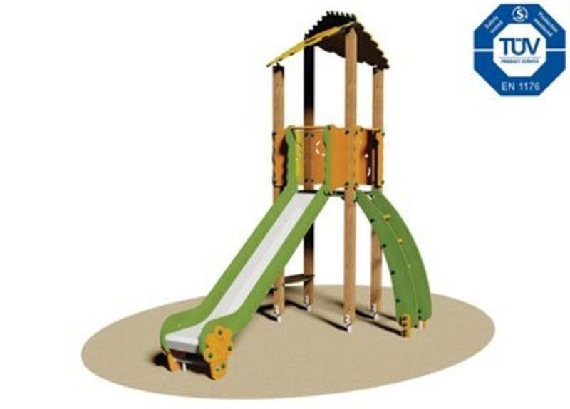 - Panells: 4 panells protectors de fusta tractada acolorida i 1 plataforma. Amb esglaons d'iroko Ø 45 mm fets de contraxapat. Equipat amb tub de seguretat.